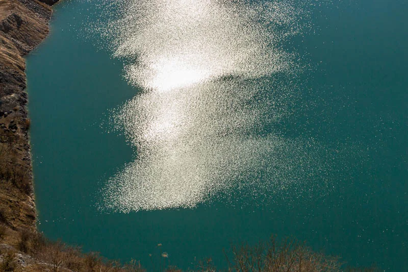 Schon der erste Blick auf die Blaue Lagune wirkt überraschend. Je nach Lichteinfall schillert das Wasser von Türkis bis dunklem Blau, während sich das Sonnenlicht auf der Wasseroberfläche spiegelt. Der Kontrast zwischen dem ruhigen See und den steilen Abbauwänden des Steinbruchs verleiht diesem Ort eine ganz besondere Atmosphäre.
