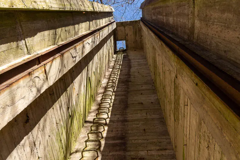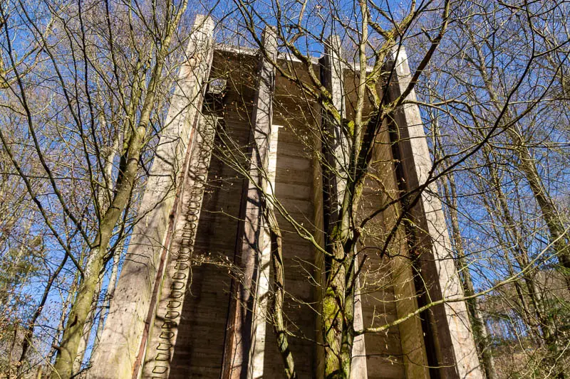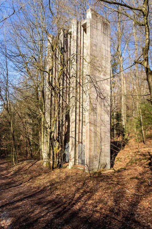 Noch bevor wir den Steinbruch erreichten, führte der Weg durch ein Waldstück. Am Rand des Weges standen Hinweisschilder, die davor warnten, den Weg zu verlassen – abseits bestehe Lebensgefahr. Zwischen Bäumen und Gestrüpp waren zudem Überreste alter Mauern und kleiner Bauwerke zu erkennen. Und dann stand da dieser Betonklotz am Wegesrand, der zusammen mit den Warnschildern und den Ruinen im Wald unsere Fantasie beflügelte. Wir kamen auf allerhand Gedanken, was es mit diesem Bauwerk wohl auf sich haben könnte.
