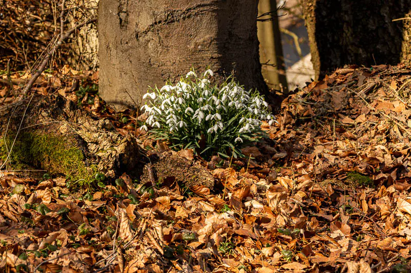 An dieser Stelle begegneten wir einem freundlichen Mann, der mit Schubkarre und Schaufel unterwegs war und uns die Geschichte hinter den Blumen erzählte. Ursprünglich hatte er einige Schneeglöckchen aus seinem Garten hier ausgesetzt. Jedes Frühjahr nimmt er sich ein paar davon wieder mit nach Hause. Sind sie dort verblüht, bringt er sie zurück in den Wald, wo sie sich weiter vermehren.