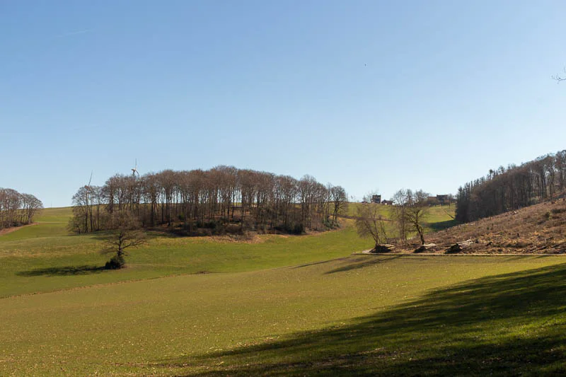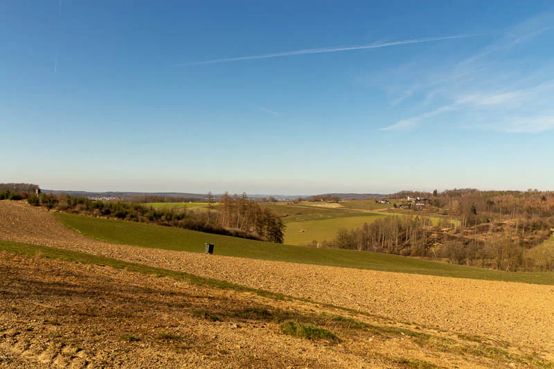 Sanfte Hügel, weite Felder und kleine Waldstücke wechseln sich ab, dazwischen immer wieder einzelne Höfe oder schmale Wege, die sich durch die Landschaft ziehen. Gerade an klaren Tagen wirkt die Region offen, ruhig und entschleunigend – perfekt für eine Wanderung abseits vom Trubel.