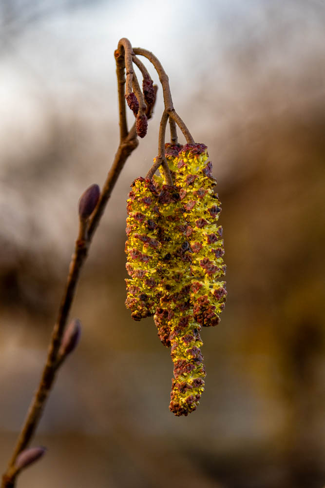 Das hier gezeigte Bild habe ich an einer Stelle aufgenommen von der ich aus dem Sommer weiß, dass dort sowohl Haselnuss als auch junge Erlen wachsen. Die Blütenstände beider Pflanzen sind leicht zu verwechseln solange noch keine Blätter zu sehen sind. Ich bin aber ziemlich sicher, hier Erlenkätzchen abgelichtet zu haben.