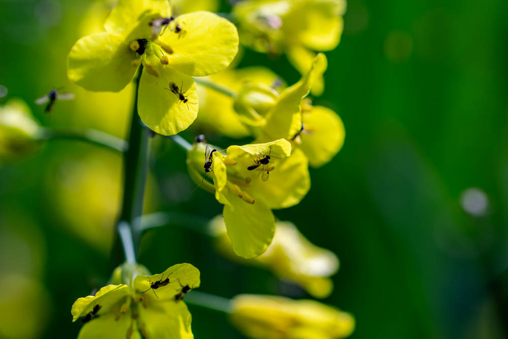 Ordentlich Betrieb herrschte im Rapsfeld. Neben Hummeln und Bienen schwirrten besonders viele kleine schwarze Insekten umher.