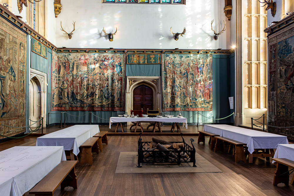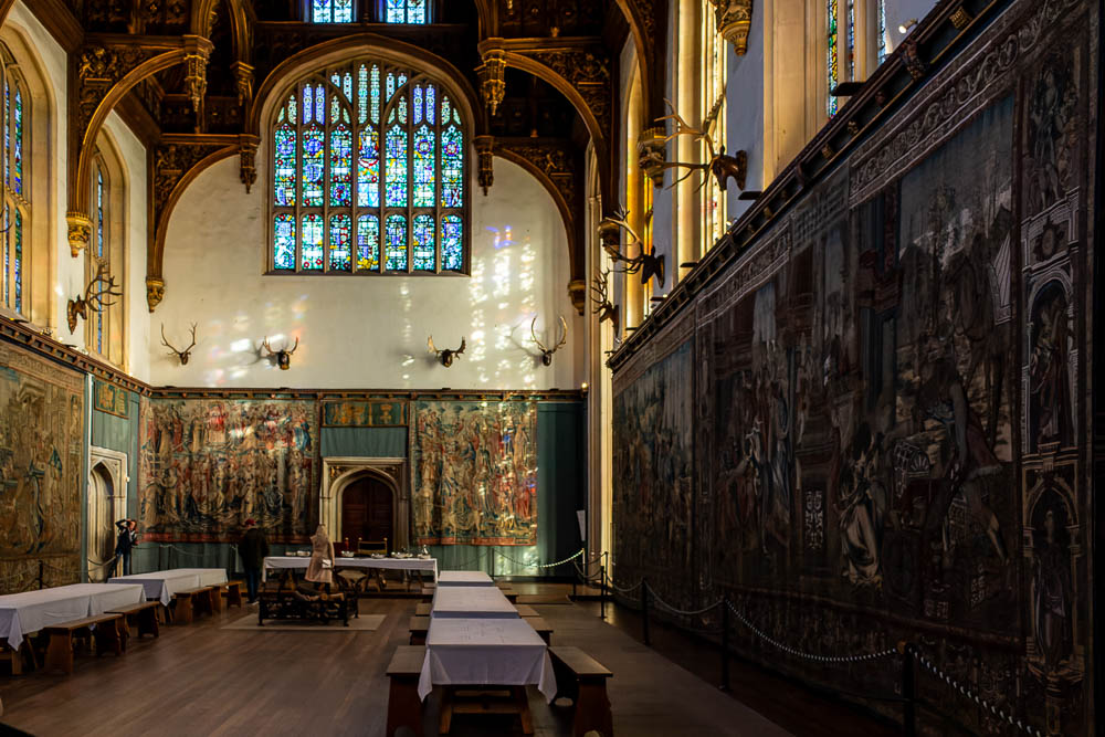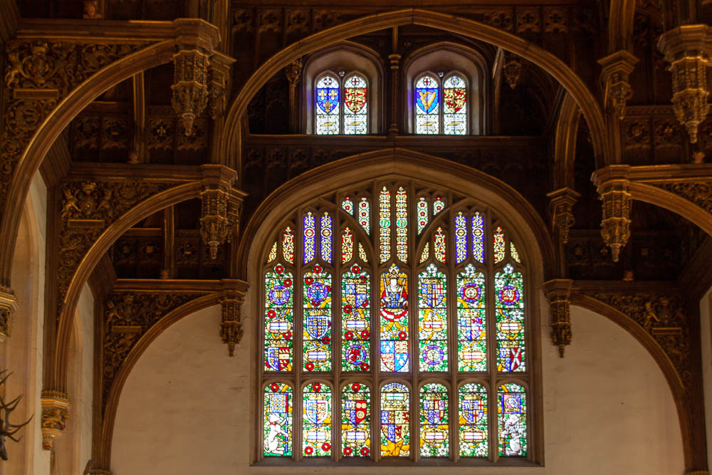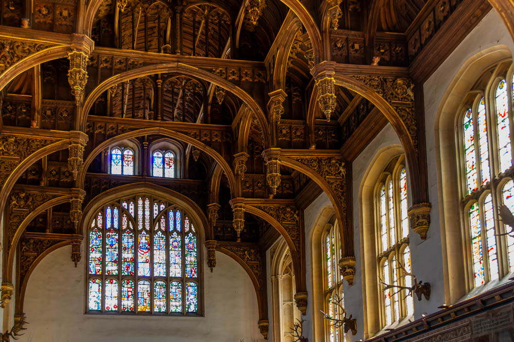 Die Decke des 18 Meter hohen Raumes ist besonders beeindruckend. Dieses mit aufwendigen Schnitzereien versehene Kunstwerk wird als Hammerbalkendach bezeichnet.