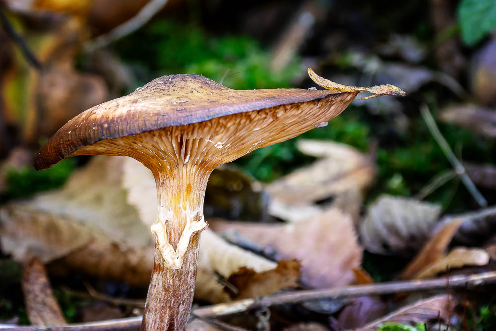 Herbst-Impressionen – Balanceakt Diesen Pilz entdeckte ich am Wegesrand – es ist wohl ein Trichterling. Interessant ist der Balanceakt des Blattes am Rand der Hutes.