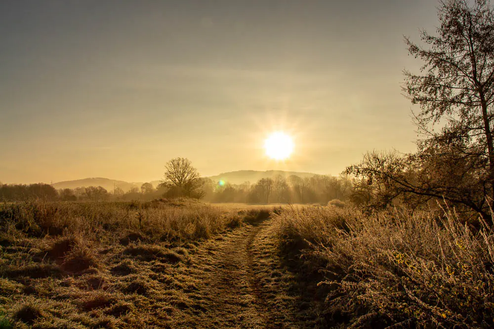 An einem eiskalten Morgen im Dezember kam mir in den Sinn, ein paar Bilder von frostiger Winterlandschaft zu machen. Ein perfekter Ort dafür liegt direkt vor meiner Haustür, das Naturschutzgebiet Kiebitzwiese hier in Fröndenberg. Und schon der erste Ausblick zeigte, dass sich das frühe Aufstehen gelohnt hatte. Die noch tiefstehende Sonne verwandelte die frostige Landschaft in ein Meer aus Goldtönen.