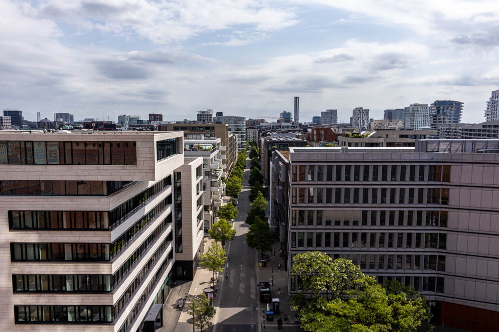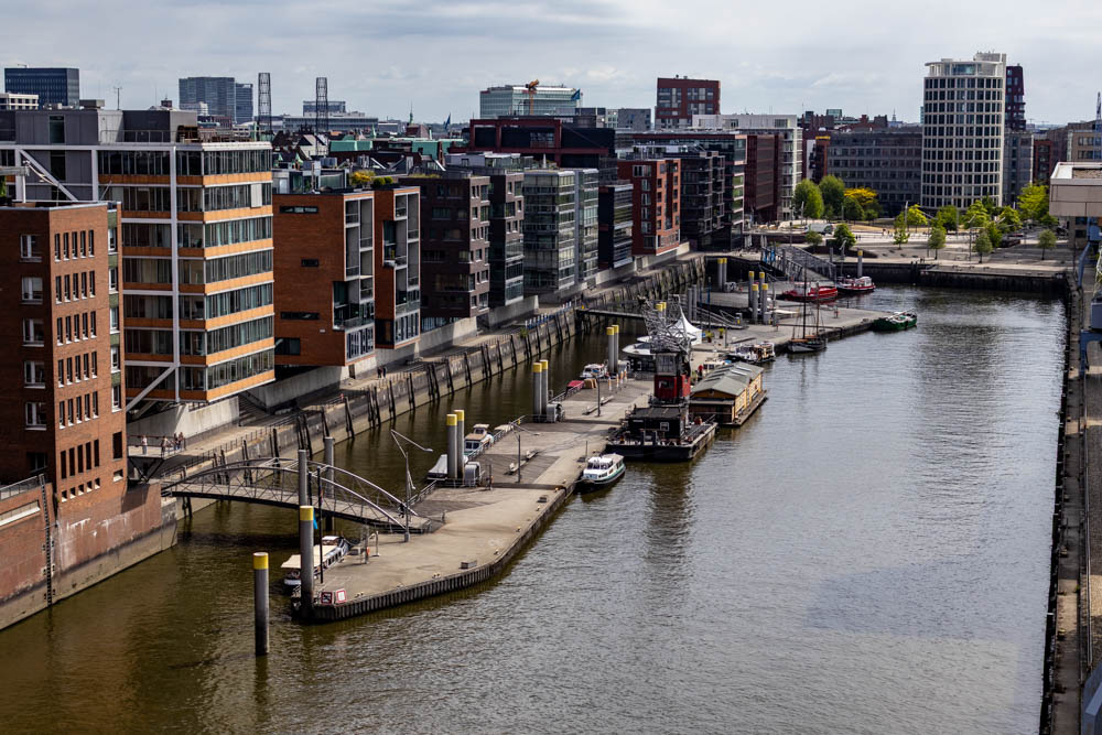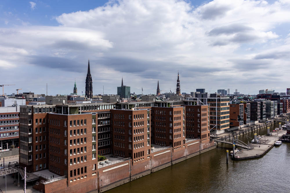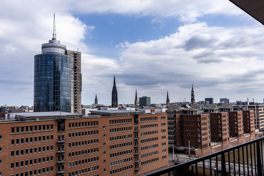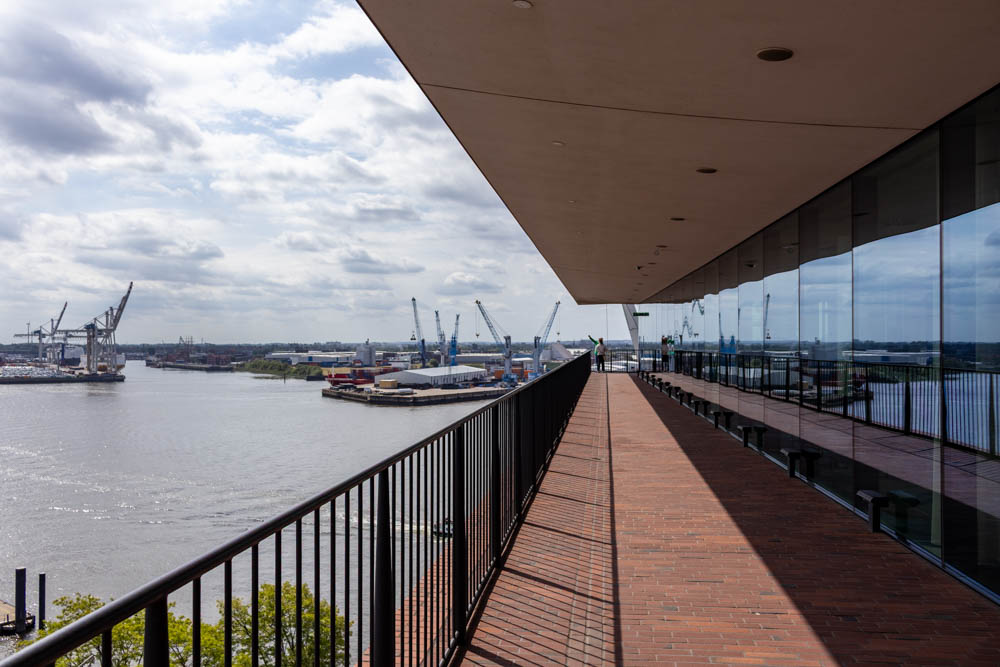 Die Plaza verläuft rund um das Gebäude in 37 Metern höhe, zwischen dem alten Speicher und dem daraufgesetzten Glasbau.