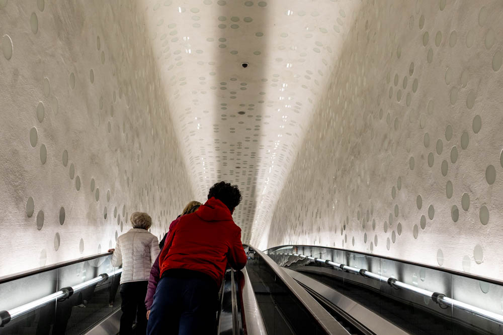 Zur Aussichtsplattform gelangt man über eine 82 Meter lange Rolltreppe, das dauert ungefähr 2 Minuten.