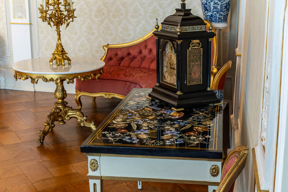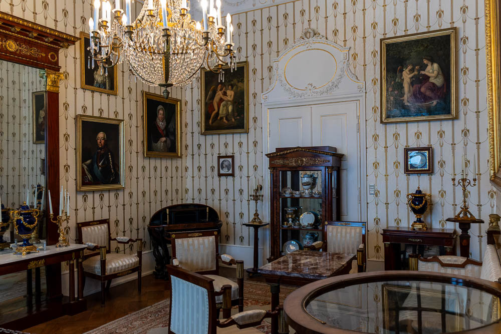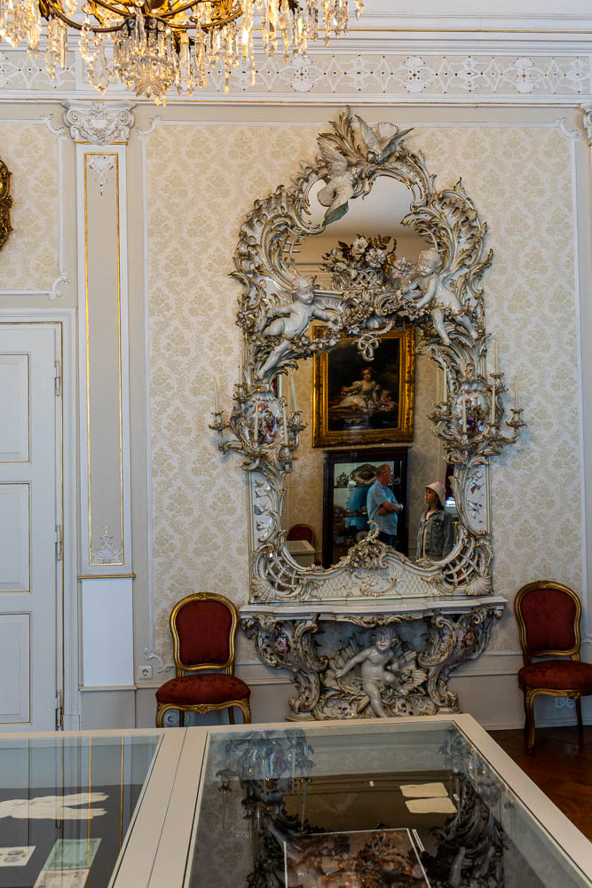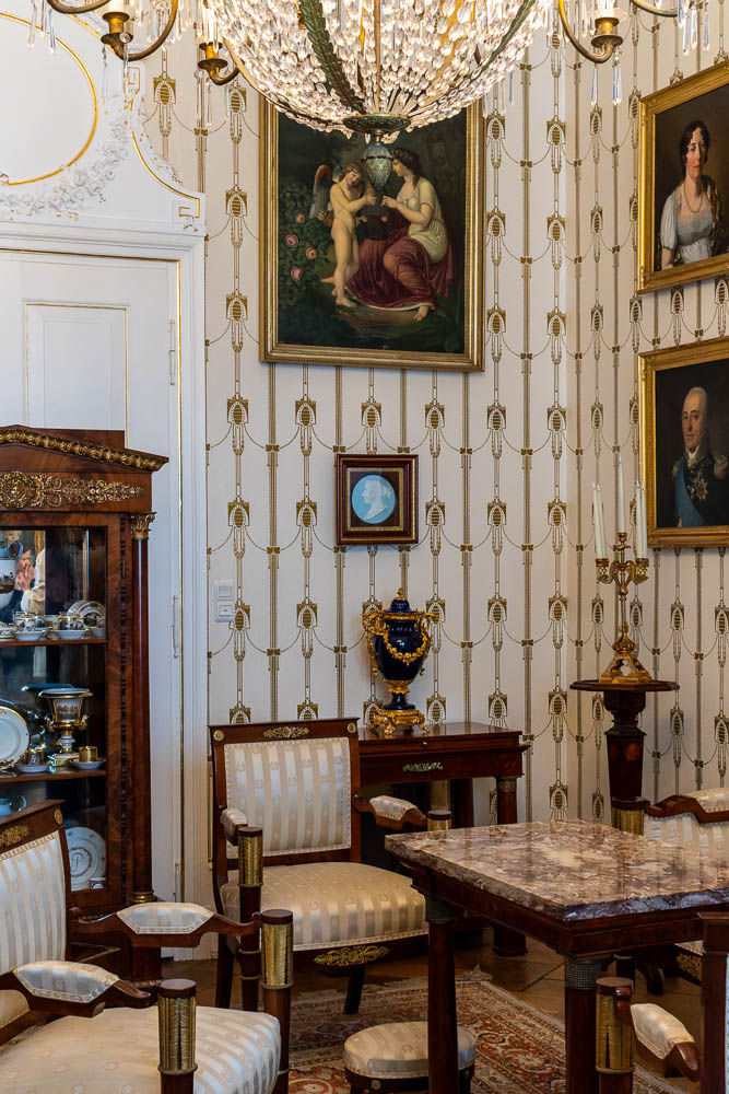 Weiter geht die Schlossführung mit dem Elisabethsaal und dem Empirezimmer. Der Elisabethsaal wurde erst 1905 eingerichtet, wirkt aber wie ein Raum aus dem späten Barock. Neben kunstvollen Möbeln gibt es hier auch allerhand edles Porzellan aus berühmten Manufakturen zu bestaunen.