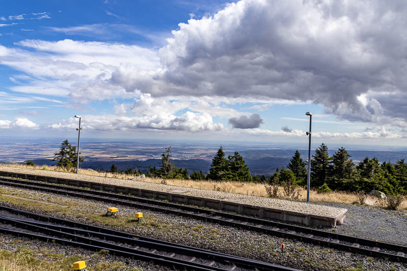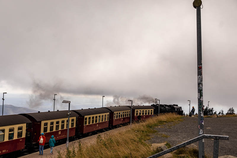 Wenn man runter schauen will muss man ja erstmal nach oben. Eine Möglichkeit den Brockengipfel zu erreichen, ist zu Fuß auf einer der zahlreichen Wanderrouten. Bequemer geht mit es mit der Harzer Schmalspurbahn (HSB), genau gesagt mit der Brockenbahn, zum Beispiel ab Wernigerode. Die historischen Wagen werden von einer Dampflok über die steilen Gleise zum Gipfel gezogen – für viele Besucher ein Highlight für sich.