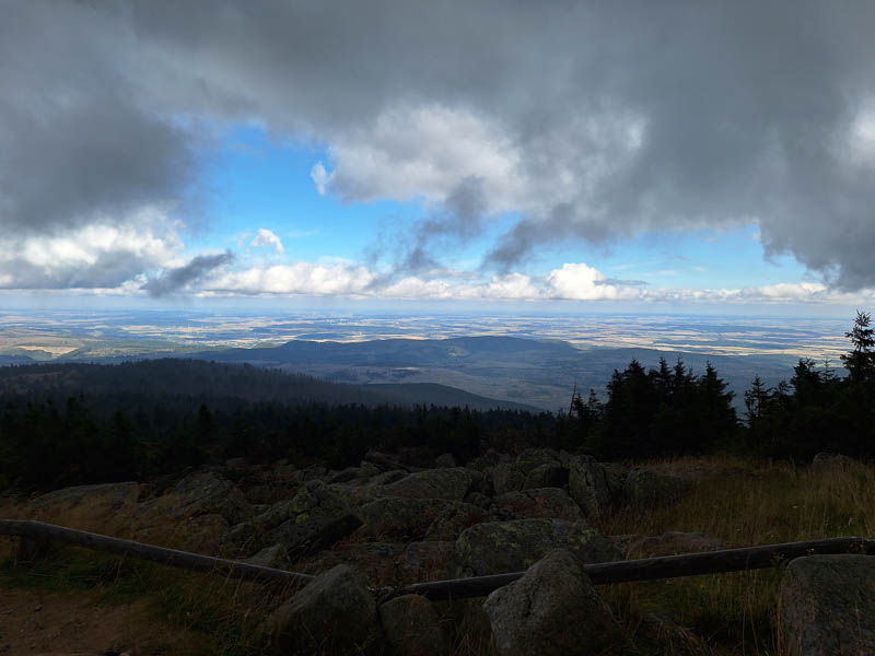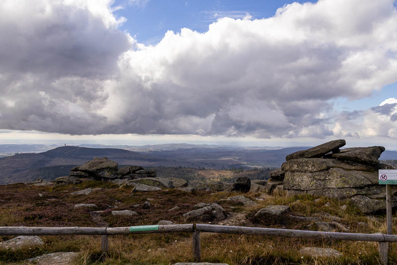 Die Landschaft hier oben ist karg, dafür ist aber die Aussicht fantastisch. Wenn sich der Nebel lichtet eröffnet sich ein wundervolles Panorama über die bewaldeten Hügel des Harz und die Ebene.