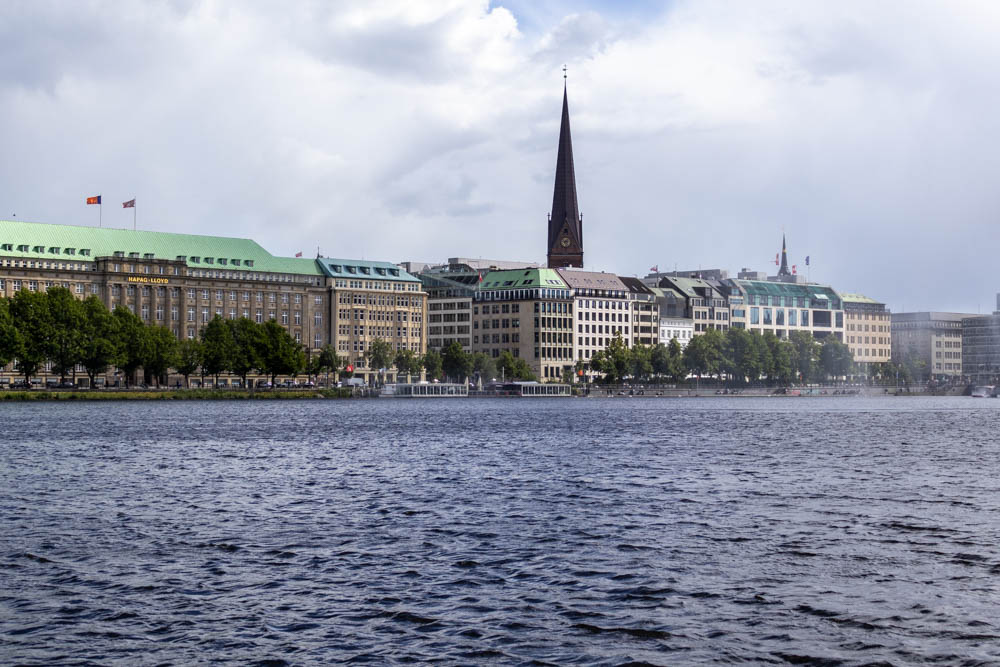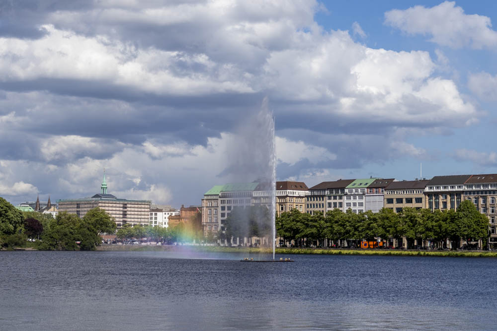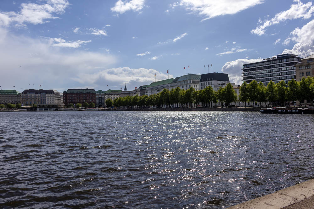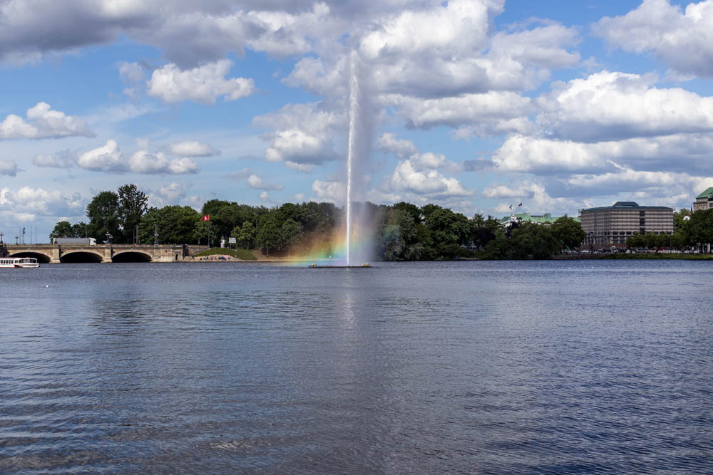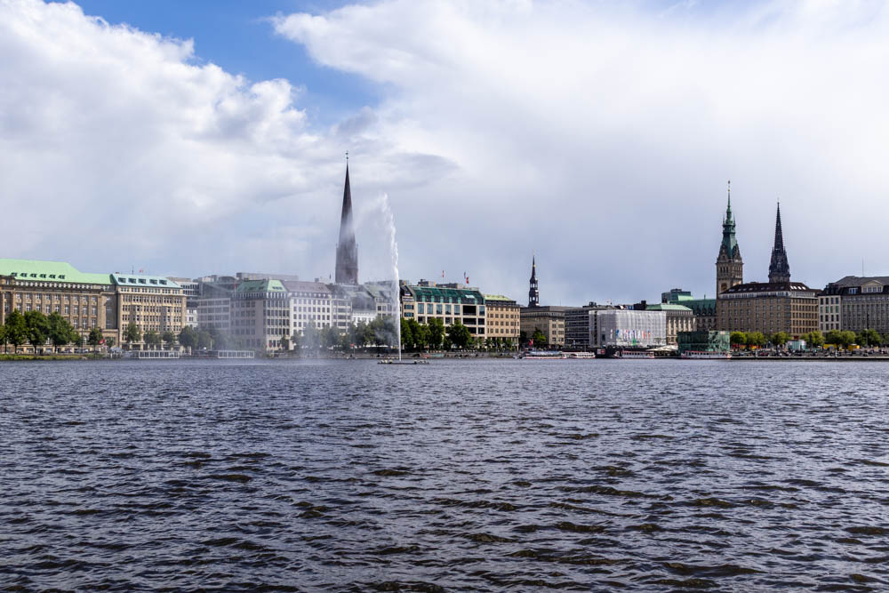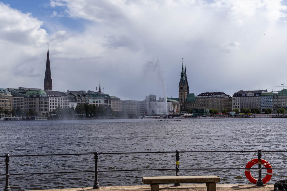 Von hier hat man einen schönen Ausblick auf das Panorama von Hamburg. In der Mitte des Sees befindet sich die Alsterfontäne, die traditionell vom Frühlingsanfang bis in den November bis zu 50 Meter hoch sprudelt.