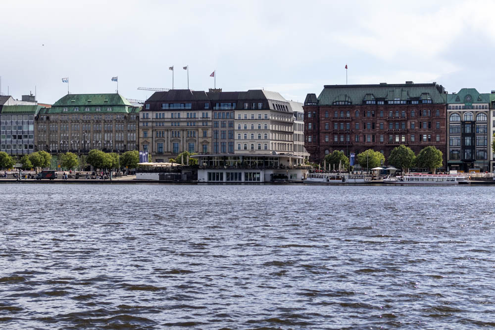 Die Gebäude auf dem folgenden Bild stehen entlang der Straße „Jungfernstieg“, der Prachtmeile Hamburgs. Das zweite Gebäude von rechts ist das bekannte Luxuskaufhaus „Alsterhaus“. Direkt am Wasser ist der Alsterpavillon zu sehen – dort unterbrechen wir unseren Spaziergang für eine Erfrischung.