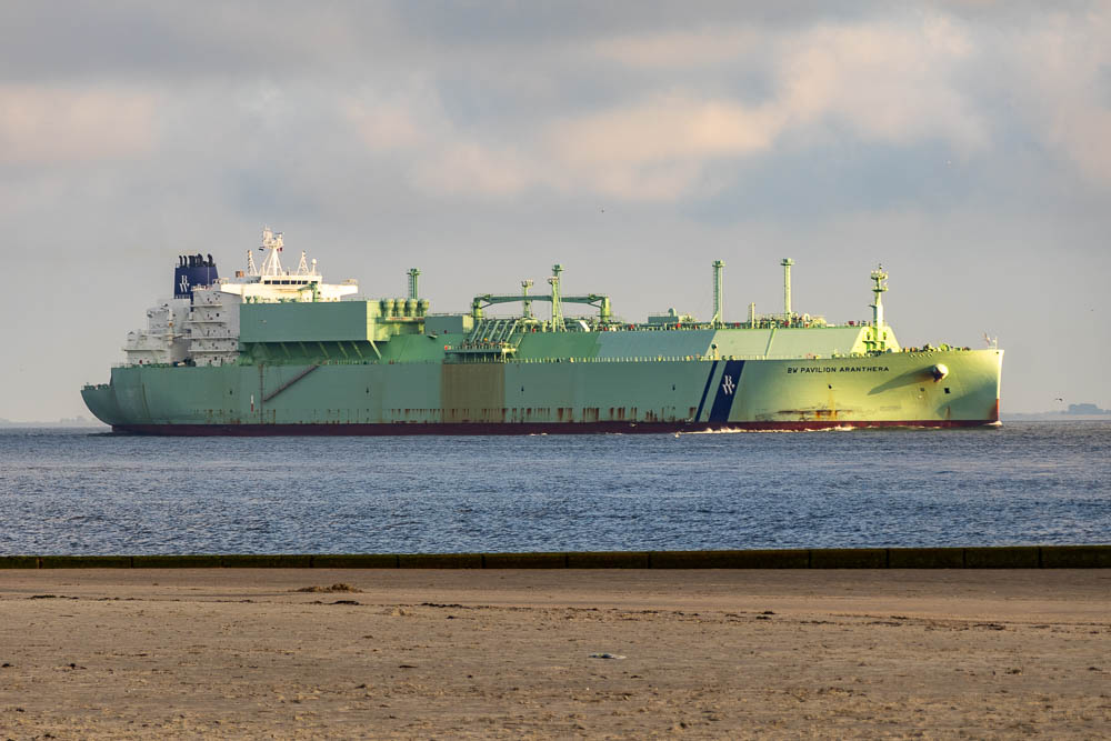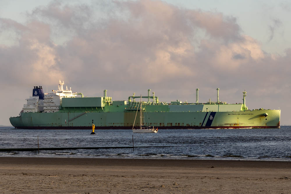 Der Riesen Kahn, der hier vorbeifährt ist ein LNG-Tanker (Liquefied Natural Gas / Flüssig-Erdgas). Die „BW Pavilion Aranthera“ wurde im Jahr 2020 fertiggestellt und ist einer der modernsten Flüssiggastanker weltweit. 300 Meter lang und rund 50 Meter breit. Zum Größenvergleich kam wie auf Bestellung ein Segelboot daher.