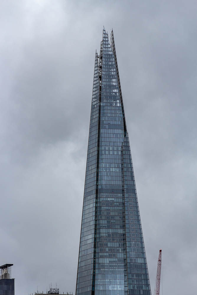 „The Shard“ (die Scherbe) heisst dieses pyramidenförmige Hochhaus in London. Die Fassade besteht aus reichlich Scherben: ca. 11000 Glasplatten mit einer Gesamtfläche von rund 56000 Quadratmetern bilden die Hülle für 72 nutzbare Etagen. Drüber befinden sich dann noch 15 Etagen, in denen die Technik für das 309 Meter hohe Gebäude untergebracht ist.