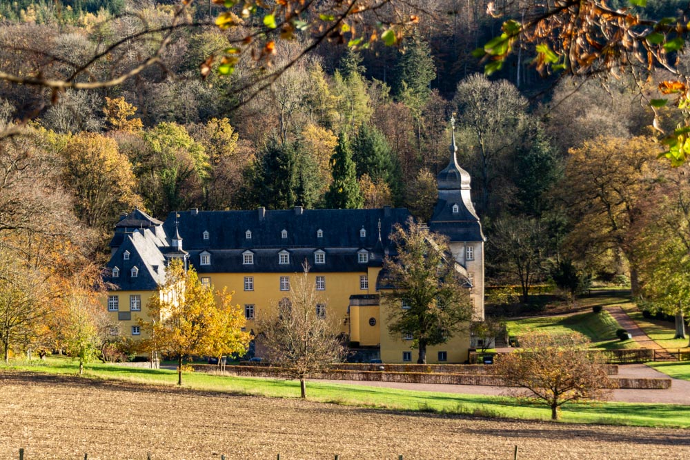 Am Ende des Waldweges haben wir Aussicht auf Schloss Melschede. Erbaut wurde es zwischen 1659 und 1669. Heute wird das Schloss für verschiedene Veranstaltungen genutzt, z.B. Tagungen, Hochzeiten und Konzerte.