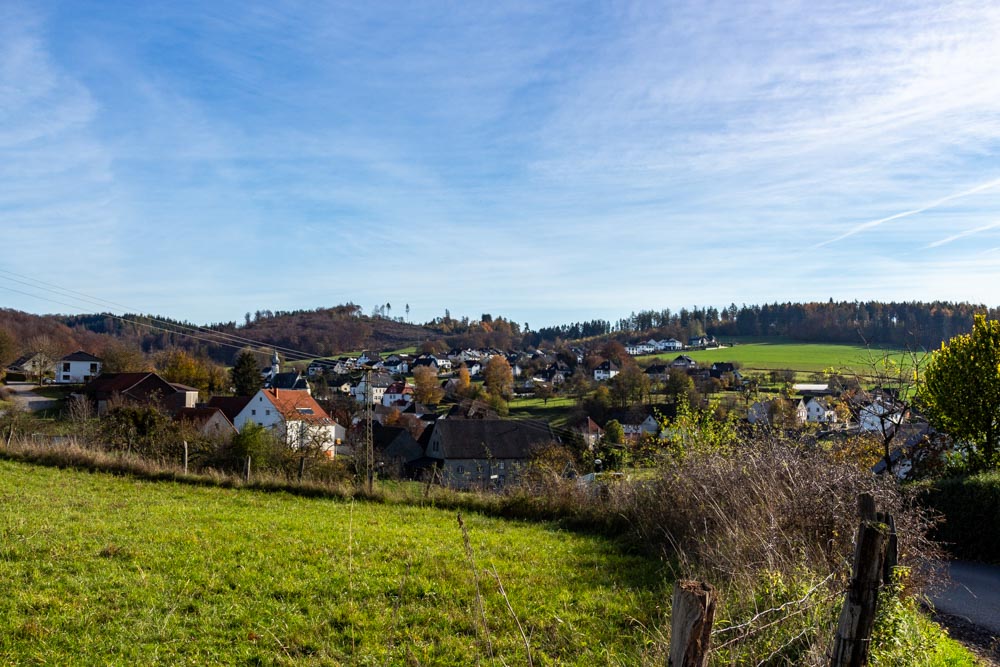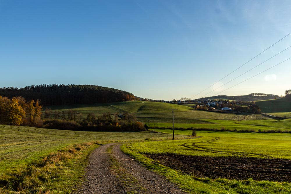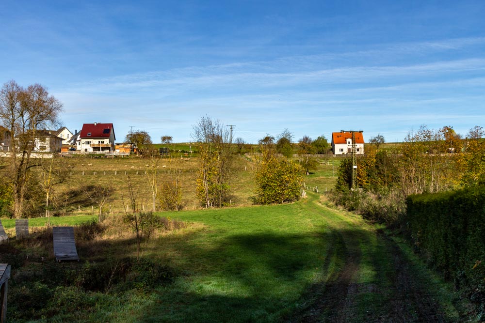Von dort geht es über einen Wiesenpfad mit Aussicht auf die Stadt und die herbstliche Landschaft.