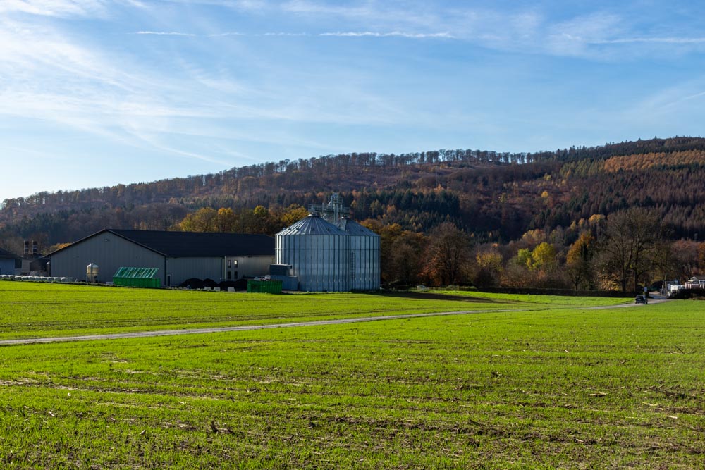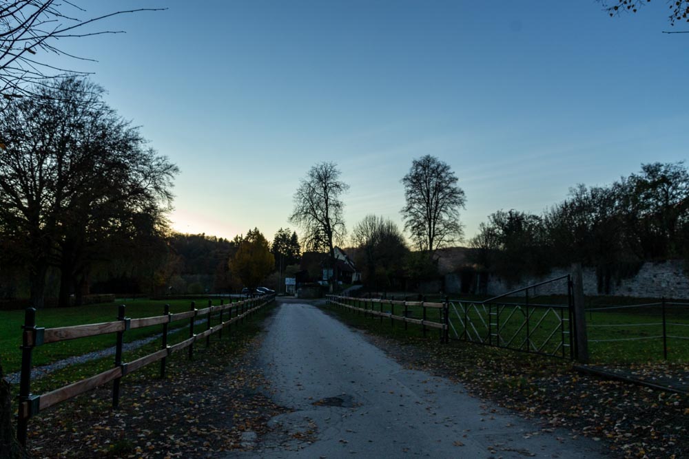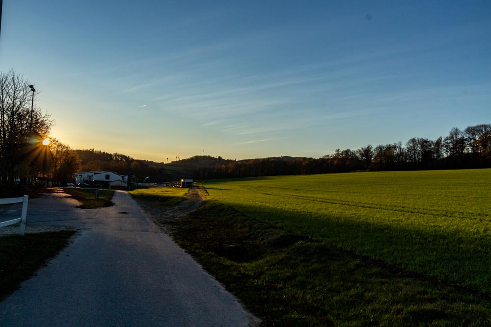 Nach dem Feldweg kommen wir auf einen asphaltierten Weg, an dem eine Ansammlung kleiner Gebäude zusehen ist.